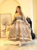 👗 اللون بيج مائل للذهبي بلمعة فخمة، مثالي للمناسبات والطلعات المميزة.